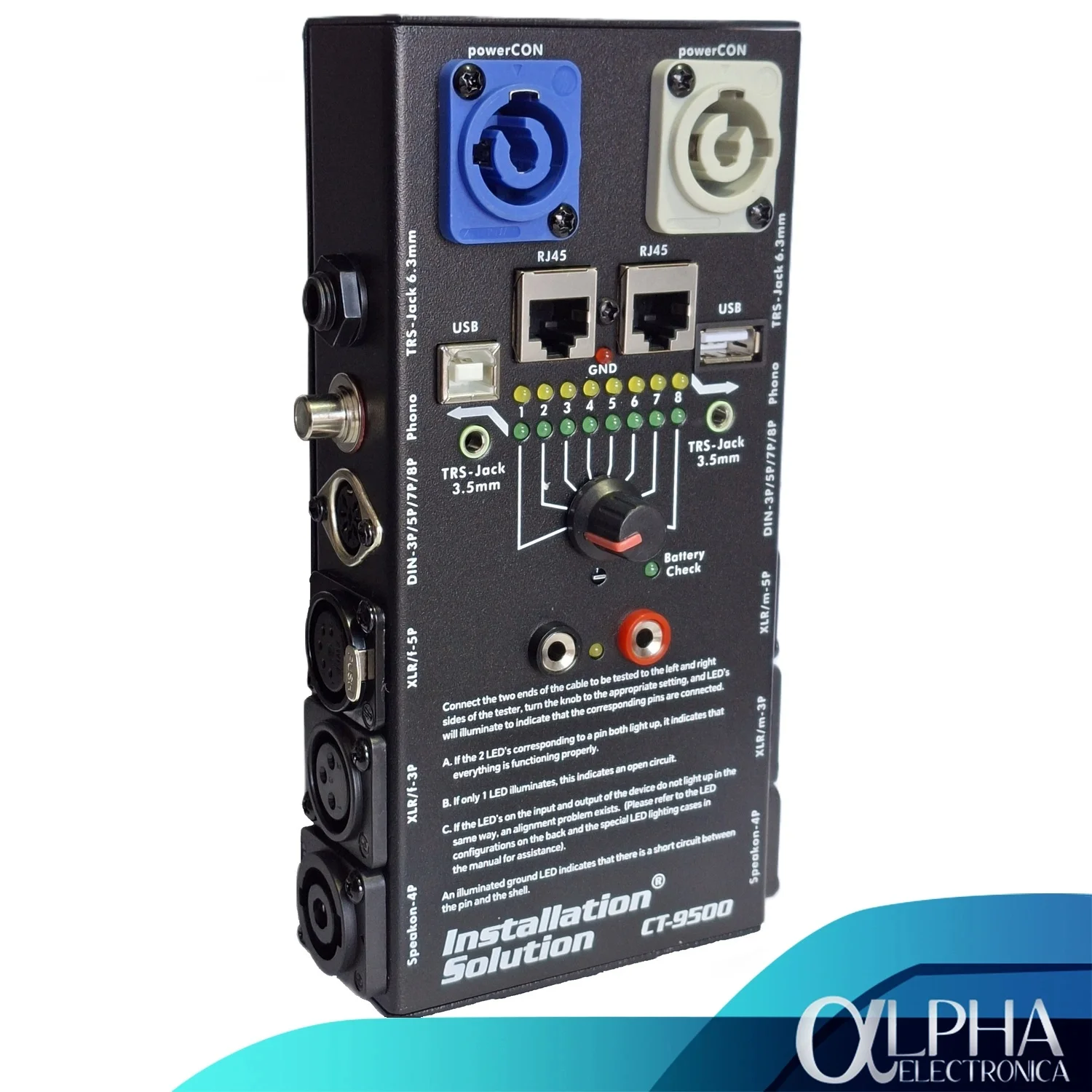 El CT-9500 es un probador de cables versátil y profesional que asegura la continuidad y conexión en una amplia variedad de cables: XLR, Plug 3.5 mm / 6.35 mm, RCA, RJ45, USB, DIN y Speakon. Compacto, resistente y fácil de usar, es ideal para instaladores, técnicos de audio y músicos que buscan máxima confiabilidad en sus conexiones.