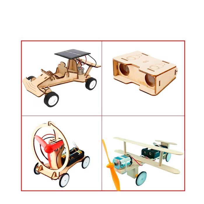 El kit incluye 4 proyectos diferentes que se ensamblan fácilmente con piezas de madera, motores, ruedas, hélices y paneles solares:
